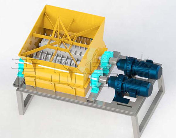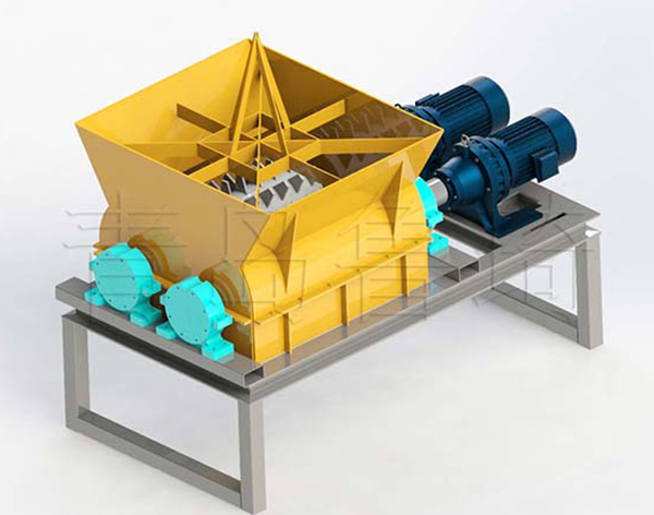 在各种化工行业中都很多物料都是吨袋式存储原料,例如农业生产中用到的磷酸铵类肥料、生物肥料、有机肥料,畜牧业中的饲料颗粒等等,这些物料由于自身性质以及存储条件的局限,在长久的存放时会受季节、温度、湿度的影响造成受潮板结的现象。针对于这种物料板结现象解决办法就是人工用木棍、锤头等敲击粉碎。在敲打过程中耗费人力物力工作效率较低,还易造成包装袋的破损影响运输,以及物料敲打不均仍存在结块,不能有效的解决各种板结物料的松散问题。